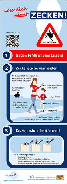 Zecken können Überträger verschiedener Krankheitserreger sein. Dieser Aufkleber gibt kurz und anschaulich wertvolle Tipps, um Zeckenstiche und deren mögliche Folgeerkrankungen zu vermeiden und zeigt, wie Zecken entfernt werden sollten. Ein QR-Code führt zu weiteren Informationsquellen. Dieser Sticker im Format 8 x 22 cm ist kostenfrei bestellbar - wie auch die ebenfalls zur Kampagne "Lass Dich nicht Zecken!" gehörenden Flyer (Art.Nr.: lgl_ges_000116) und Plakate (Art.Nr:. lgl_ges_00117) .| Herausgeber | : | Bayerisches Landesamt für Gesundheit und Lebensmittelsicherheit |
