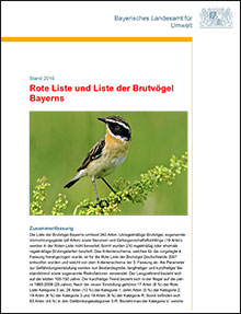 Die Liste der Brutvögel Bayerns umfasst 240 Arten. Für die Erstellung der vierten Fassung der Roten Liste der Libellen wurden 210 Arten bewertet, d. h. Neozoen wie die Nilgans (19 Arten) und elf unregelmäßig brütende Arten wurden nicht berücksichtigt. Die Rote Liste enthält 93 Arten oder 44 %.Herausgeber | : | Bayerisches Landesamt für Umwelt |