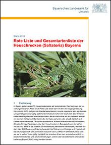 Die vierte Fassung der Roten Liste der gefährdeten Heuschreckenarten Bayerns enthält eine Gesamtartenliste aller in Bayern nachgewiesenen Arten. Von den 77 heimischen Arten stehen 33 (45 %) auf der Roten Liste.| Herausgeber | : | Bayerisches Landesamt für Umwelt |