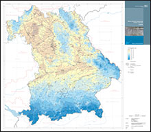 Karte (ca. A0) mit Infoblatt (A4, rückseitig)Die Karte zeigt die flächenhafte Verteilung der Wasserbilanzgröße "mittlere jährliche Niederschlagshöhe" in Bayern für den Zeitraum 1981-2010.