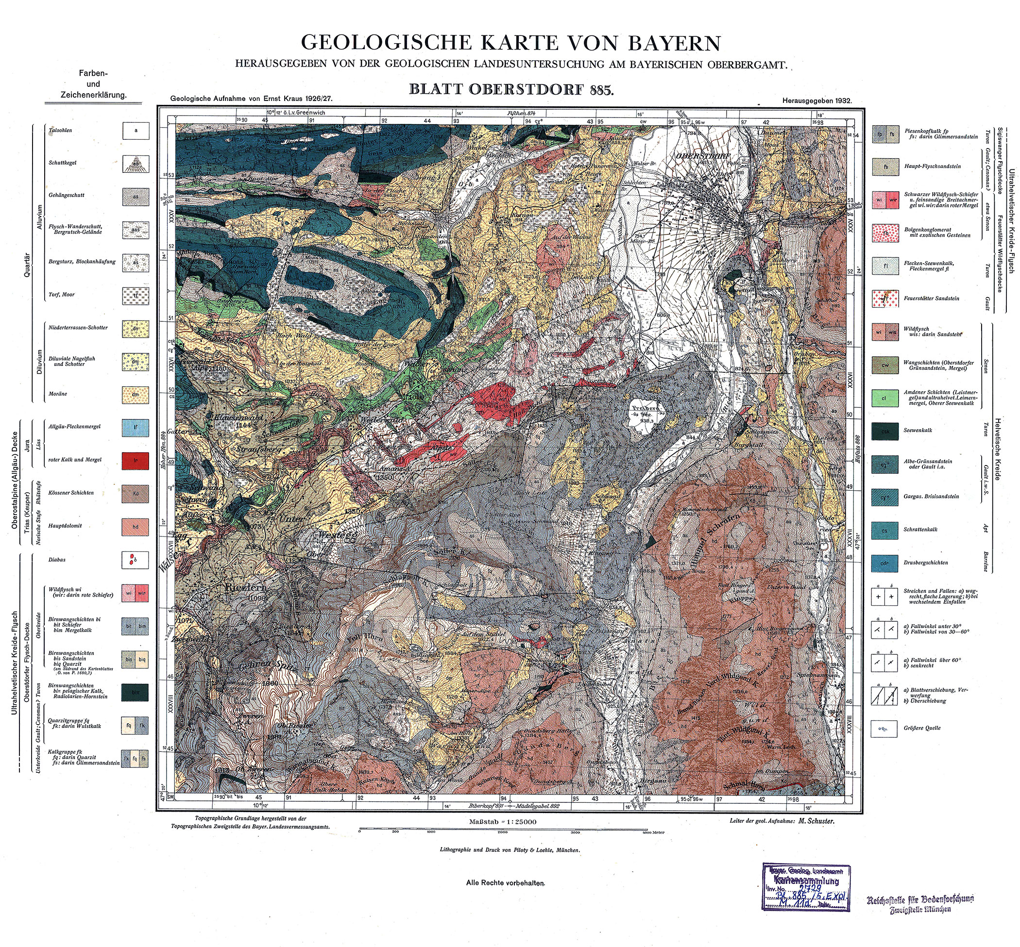 Historische Geologische Karten wurden vor 1945 von Vorgängerinstitutionen des Bayerisches Landesamtes für Umwelt (insb. Königl. Bayer. Oberbergamt) erstellt. Diese Karten gelten heute nicht mehr als amtliche geologische Karte, stellen aber wissenschaftsgeschichtlich wertvolle Dokumente dar. In den vorhandenen Erläuterungen finden sich zudem häufig ausführliche Beschreibungen zu heute nicht mehr vorhandenen Aufschlüssen.Weitere Informationen über die Daten sowie Online-Kartendienste erhalten Sie beim Geologischen Dienst des LfU.