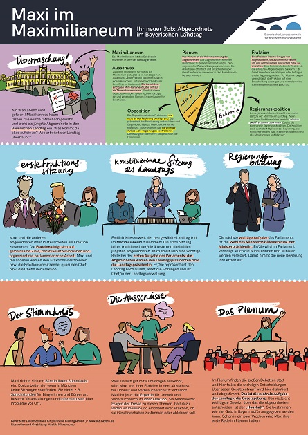 Bayern wählt! Im Vorfeld der bayerischen Landtagswahl können Sie zwei Lernplakate für Ihren Unterreicht bestellen. Die Plakate im Format DINA1 illustrieren anschaulich die wesentlichen Informationen zur Wahl. Ein Plakat stellt das bayerische Wahlsystem grafisch dar und erläutert in Erklärtexten zentrale Elemente des Wahlprozesses. Das andere Plakat erzählt in comichaften Zeichnungen die Geschichte einer neu gewählten, jungen Abgeordneten und erklärt Aufgaben und Arbeitsweise des Bayerischen Landtags.Bitte beachten Sie folgende Hinweise:
