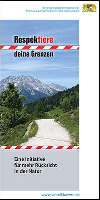 Seit 2022 ist Bayern als erstes deutsches Bundesland Bündnispartner der in Vorarlberg gestarteten Initiative "Respektiere deine Grenzen". Die grenzübergreifende Initiative zielt darauf ab, durch Informationen die Freizeitaktivitäten Erholungssuchender in Einklang mit der Natur und der Arbeit von Bäuerinnen und Bauern sowie der Forstwirtschaft zu bringen.| Herausgeber | : | Bayerisches Staatsministerium für Ernährung, Landwirtschaft, Forsten und Tourismus |