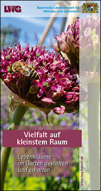 Sie möchten etwas für die Artenvielfalt vor der Haustür tun, haben aber nur einen kleinen Garten? In der Broschüre "Vielfalt auf kleinstem Raum - Lebensräume im Garten gestalten und erhalten" hat die Technikerklasse Garten- und Landschaftsbau (Jahrgang 2019/20) der Staatlichen Meister- und Technikerschule Veitshöchheim zahlreiche Tipps zusammengestellt, die einfach umgesetzt werden können.Weitere Publikationen der LWG: www.lwg.bayern.de