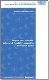 Infants need a lot of sleep. In the first few months they sleep on average 16 to 19 hours a day. At three months they still need around 13 to 15 hours a day. We would like to provide you with the information you need in order to create an optimal sleeping environment for your baby.| Herausgeber | : | Bay. Ministerium für Umwelt, Gesundheit und Verbraucherschutz |