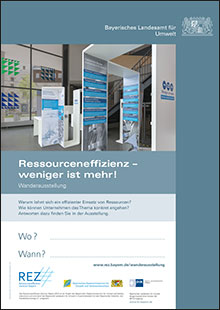 Das Poster soll Interessierte an der Wanderausstellung "Ressourceneffizienz - weniger ist mehr!" ansprechen und auf den jeweiligen Standort aufmerksam machen. Für Ausleihende kann es zur Bewerbung der Ausstellung dienen.| Herausgeber | : | Bayerisches Landesamt für Umwelt |