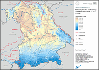 Karte (A3) mit Infoblatt (rückseitig)Als Karte dargestellt ist die flächenhafte Verteilung der Wasserbilanzgröße "mittlere jährliche Niederschlagshöhe" in Bayern für den Zeitraum 1971-2000.