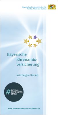 Das Faltblatt informiert über die zum 1. April 2007 in Kraft getretene Bayerische Ehrenamtsversicherung. Sie gewährt als Sammel-Haftpflicht- und als Sammel-Unfallversicherung Schutz für ehrenamtlich/freiwillig Tätige. Die von der Staatsregierung mit der Versicherungskammer Bayern abgeschlossenen Verträge schützen insbesondere Ehrenamtliche in den vielen kleinen, rechtlich unselbstständigen Initiativen, Gruppen und Projekten.| Herausgeber | : | Bayerisches Staatsministerium für Familie, Arbeit und Soziales |