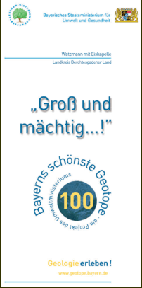 Mit fast 1800 Meter Höhe ist die berühmte Ostwand des Watzmann eine der höchsten Felswände der Ostalpen. An Fuß des imposanten Gebirgsstockes am Ende des Eisbachtals bei St. Bartholomä am Königsee befindet sich das tiefstgelegene dauerhafte Firneisvorkommen im deutschen Alpenraum. Dort hat sich eine Eishöhle gebildet, die ständig ihre Gestalt verändert.Vor Ort erläutert eine Schautafel den Geotop (PDF-Teil 2).