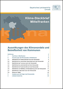 Der Klima-Steckbrief Mittelfranken fasst die wichtigsten regionalen Auswirkungen und Folgen des Klimawandels zusammen und informiert über die Betroffenheit von Kommunen in zentralen Handlungsfeldern. Der Steckbrief fasst die Folgen des Klimawandels auf die Wasserwirtschaft, die menschliche Gesundheit, den Tourismus, die Land- und Forstwirtschaft sowie auf den Städtebau und das Bauwesen in Mittelfranken zusammen und geht auf die besondere Betroffenheit von Städten ein.Der Klima-Steckbrief bietet somit die fachliche Grundlage für den Einstieg in die Klimaanpassung und soll diesen für Kommunen und Unternehmen in Mittelfranken erleichtern sowie bei der Umsetzung von Anpassungsmaßnahmen vor Ort unterstützen.