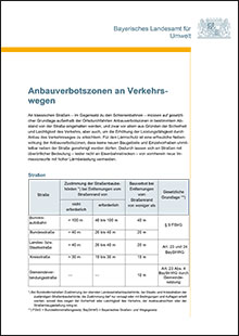 Die angegebene Tabelle enthält die vom Rand von Landverkehrswegen (Straße, Bahn) bei der Bauleitplanung zu beachtenden oder verbindlich vorgeschriebenen Mindestabstände zu schutzwürdiger Bebauung.| Herausgeber | : | Bayerisches Landesamt für Umwelt |