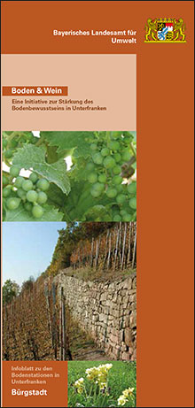 Böden entwickeln sich im Lauf von Jahrtausenden aus verwitterten Gesteinen und abgestorbenen Pflanzenresten. Die geologische Vielfalt der Gesteine sowie spezielle klimatische Bedingungen führen zur Entstehung unterschiedlicher Böden. Die in diesem Flyer vorgestellte Bodenstation befindet sich in der traditionsreichen Lage "Centgrafenberg". Hier werden Rebsorten wie Blauer Spätburgunder, Frühburgunder, Blauer Portugieser, Domina, Regent, Dornfelder, Schwarzriesling und St. Laurent angebaut. Um die Vielfalt der Böden in Unterfranken vorzustellen wurde die Reihe "Boden und Wein - Eine Initiative zur Stärkung des Bodenbewusstseins in Unterfranken" konzipiert. Die derzeitigen Bodenstationen Unterfrankens stellen wir Ihnen hier vor:Bodenstationen, Boden- und Geolehrpfade.