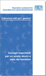 I neonati dormono molto. Vogliamo fornire informazioni su come creare un ambiente ottimale per il sonno del vostro bambino. La sindrome della morte in culla, o sudden infant death syndrome (Sids), può colpire i bambini durante il sonno nel primo anno di vita. Per fortuna succede molto raramente, però ancora oggi in Germania ci sono bambini colpiti dalla Sids. Alcune semplici misure di prevenzione aiutano a minimizzare questo rischio fin quasi a zero. Le indicazioni sul retro di questo depliant provengono dalla ricerca scientifica sono fondati sulla prassi.Questa pubblicazionae è stata stampata anche nelle sequente lingue