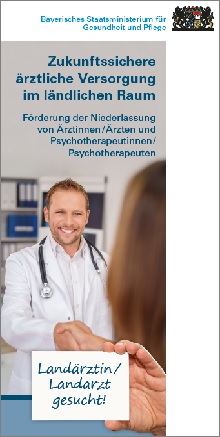 Die medizinische Versorgung in Bayern ist hervorragend. Sie zu erhalten hat für die Bayerische Staatsregierung hohe Priorität, vor allem im ländlichen Raum. Junge Ärztinnen und Ärzte haben heute andere Lebensentwürfe, als noch vor 20 Jahren. Deshalb wird es schwieriger, freie Arztsitze nach zu besetzen. Mit dem Förderprogramm "Zukunftssichere ärztliche Versorgung im ländlichen Raum" will der Freistaat mehr Ärztinnen und Ärzte für eine Tätigkeit außerhalb der größeren Städte gewinnen. Anhand dieses Flyers erhalten Sie Informationen wie der Freistaats Sie bei der Gründung oder Übernahme von Arztpraxen in Gebieten mit besonderem Nachwuchsbedarf unterstützen kann, damit eine hochwertige und flächendeckende medizinische Versorgung in allen Landesteilen erhalten bleibt.Herausgeber | : | Bayerisches Staatsministerium für Gesundheit und Pflege |