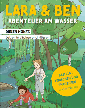 Mit der Flyer-Reihe von Lara & Ben können Kinder Monat für Monat ein Umweltthema entdecken. Jeder Flyer enthält Wissen und Tipps, um die Natur zu entdecken. Außerdem finden Kinder Rätsel und Anregungen zum Basteln und Kreativsein.Im aktuellen Flyer geht es um unsere Gewässer und um die Tiere, die man darin entdecken kannn.