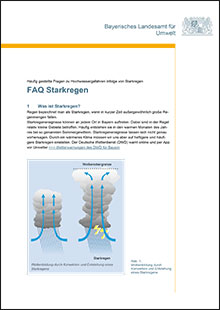 Niederschlag bezeichnet man als Starkregen, wenn in kurzer Zeit außergewöhnlich große Regenmengen fallen. Starkregenereignisse können grundsätzlich an jedem Ort auftreten und auch zu Überflutungen fern von Gewässern führen. Oft sind auch kleinere Bäche und Gräben betroffen. Bei besonders ungünstigen Bedingungen und extremem Starkregen kam es in der Vergangenheit auch in Bayern zu Sturzfluten.Die FAQ Starkregen behandelt häufig gestellte Fragen zu Hochwassergefahren infolge von Starkregen und zur Hinweiskarte Oberflächenabfluss und Sturzflut.