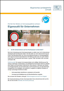 Das Eigenaudit beschreibt wie Unternehmen sich auf ein Hochwasserereignis vorbereiten können, um Schäden und finanzielle Einbußen zu verringern oder sogar zu vermeiden. Es gibt Tipps zu weiterführende Informationsquellen und enthält eine Checkliste zur Hochwasservorsorge. Außerdem wird beispielhaft die Erstellung eines Notfallplans Hochwasser erläutert.| Herausgeber | : | Bayerisches Landesamt für Umwelt |