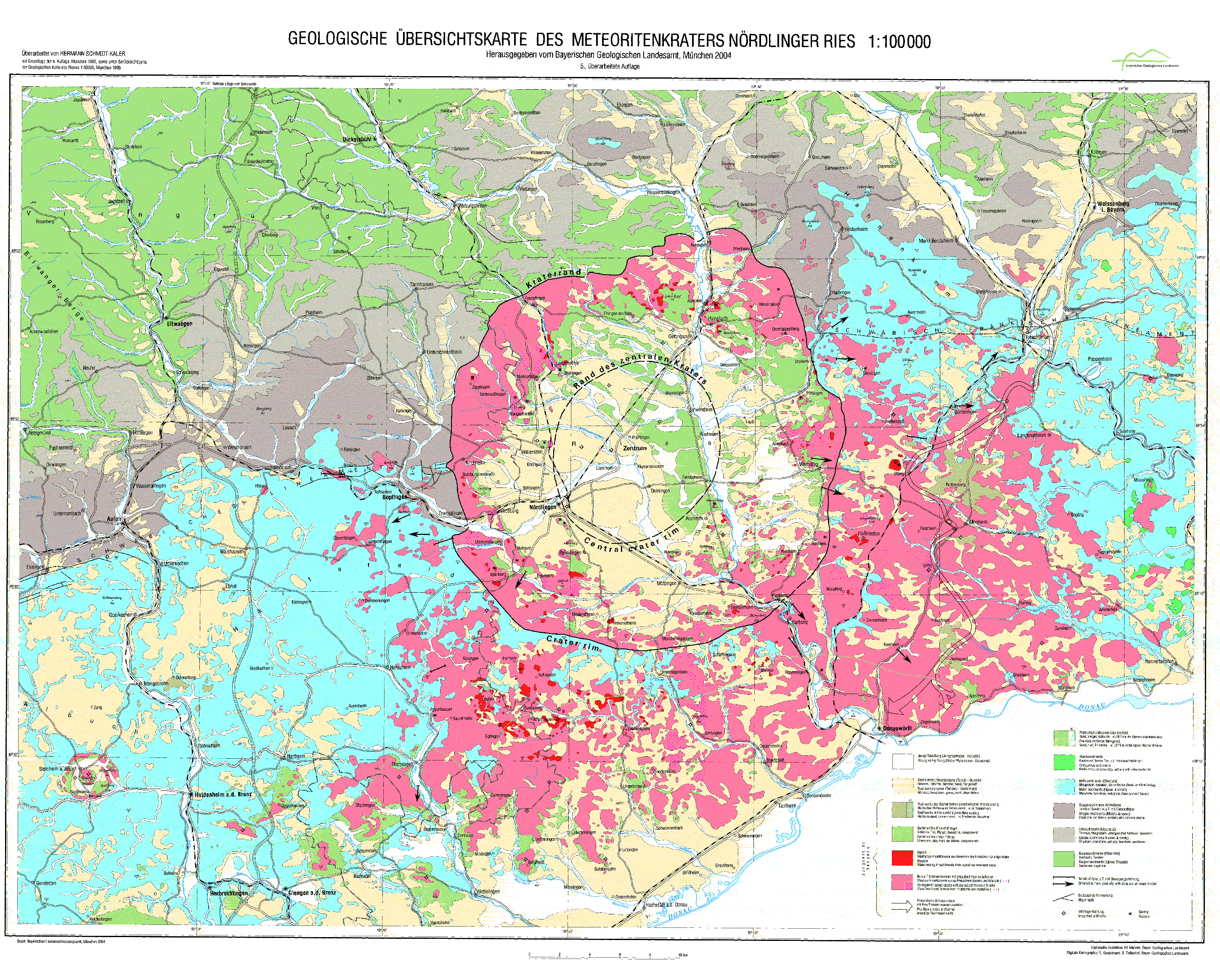 Geologische Karte 1:100 000 des Impaktraters Nördlinger Ries mit Kurzerläuterungen auf der Rückseite in deutscher und englischer Sprache