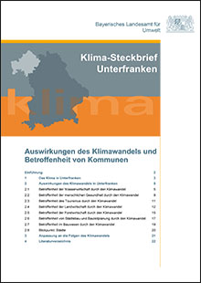 Der Klima-Steckbrief Unterfranken fasst die wichtigsten regionalen Auswirkungen und Folgen des Klimawandels zusammen und informiert über die Betroffenheit von Kommunen in zentralen Handlungsfeldern. Der Steckbrief fasst die Folgen des Klimawandels auf die Wasserwirtschaft, die menschliche Gesundheit, den Tourismus, die Land- und Forstwirtschaft sowie auf den Städtebau und das Bauwesen in Unterfranken zusammen und geht auf die besondere Betroffenheit von Städten ein.Der Klima-Steckbrief bietet somit die fachliche Grundlage für den Einstieg in die Klimaanpassung und soll diesen für Kommunen und Unternehmen in Unterfranken erleichtern sowie bei der Umsetzung von Anpassungsmaßnahmen vor Ort unterstützen.