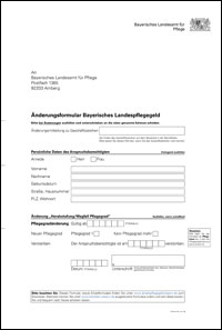 Änderungsformular Bayerisches Landespflegegeld - Änderung "Herabstufung/Wegfall Pflegegrad"| Herausgeber | : | Bayerisches Landesamt für Pflege |