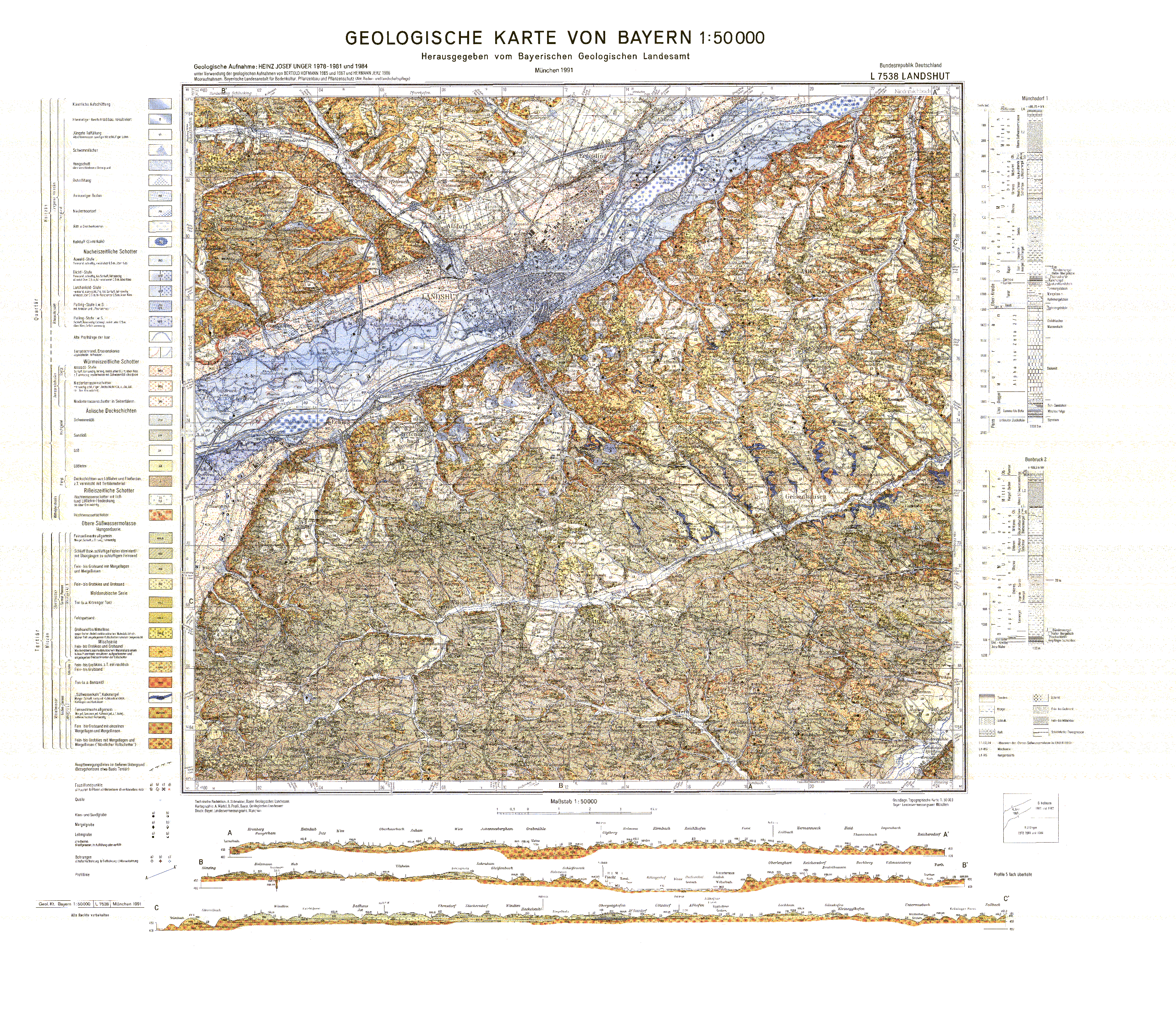 Der Maßstab 1:50 000 wurde für geologische Karten nur verwendet, falls der geologische Untergrund großflächig aus den selben Gesteinen aufgebaut ist.Weitere Informationen über die Daten sowie Online-Kartendienste erhalten Sie beim Geologischen Dienst des LfU.