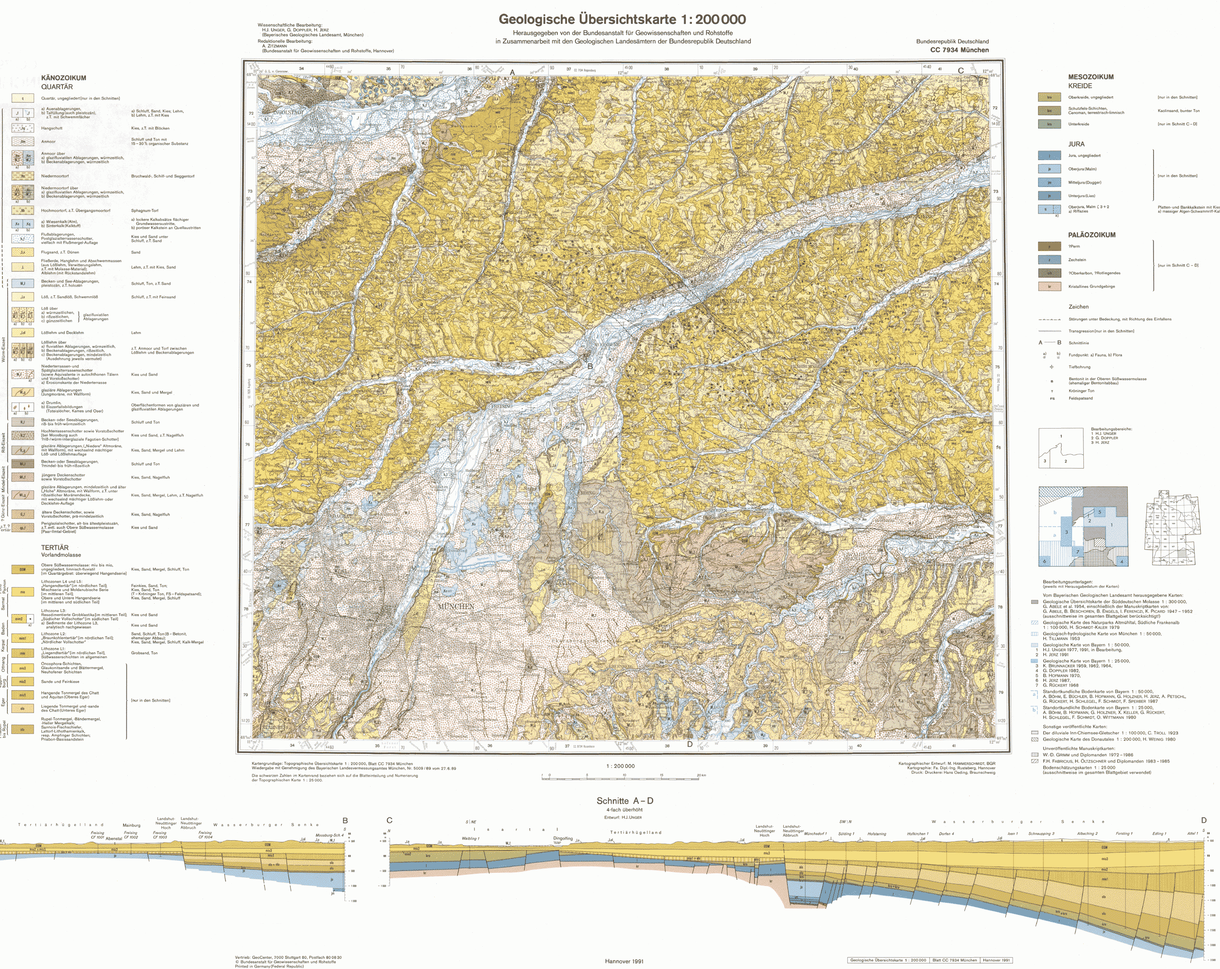 Die Geologische Karte 1:200 000 ist ein Gemeinschaftsprodukt der Staatlichen Geologischen Dienste (SGD) von Deutschland und der Bundesanstalt für Geowissenschaften und Rohstoffe (BGR) in Hannover, was zwischen 1973 und 1994 bearbeitet wurde. Dargestellt sind Stratigraphie, Petrographie und Genese der Gesteine. Zu beachten sind blattschnittbezogene Inkonsistenzen sowohl der Geometrien als auch der geologischen Einheiten, da die einzelnen Kartenblätter aus verschiedenen Bearbeitungszeiträumen stammen. Der Bezug der Vektor-Daten und der Bild-Scans erfolgt über das Produktcenter der BGR.Bezug der Vektor-Daten und der Bild-Scans über: Produktcenter der BGR