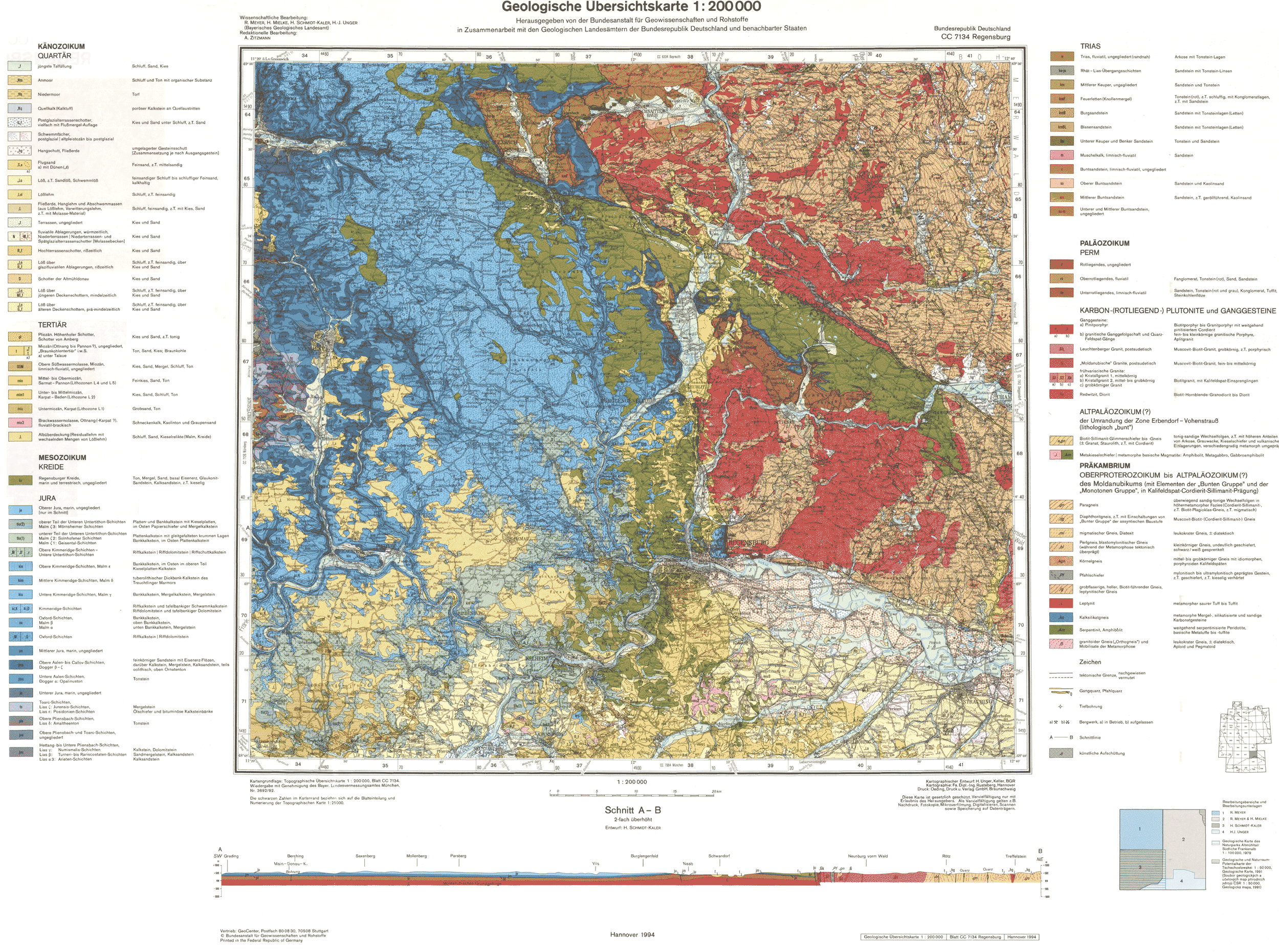 Die Geologische Karte 1:200 000 ist ein Gemeinschaftsprodukt der Staatlichen Geologischen Dienste (SGD) von Deutschland und der Bundesanstalt für Geowissenschaften und Rohstoffe (BGR) in Hannover, was zwischen 1973 und 1994 bearbeitet wurde. Dargestellt sind Stratigraphie, Petrographie und Genese der Gesteine. Zu beachten sind blattschnittbezogene Inkonsistenzen sowohl der Geometrien als auch der geologischen Einheiten, da die einzelnen Kartenblätter aus verschiedenen Bearbeitungszeiträumen stammen. Der Bezug der Vektor-Daten und der Bild-Scans erfolgt über das Produktcenter der BGR.Bezug der Vektor-Daten und der Bild-Scans über: Produktcenter der BGR