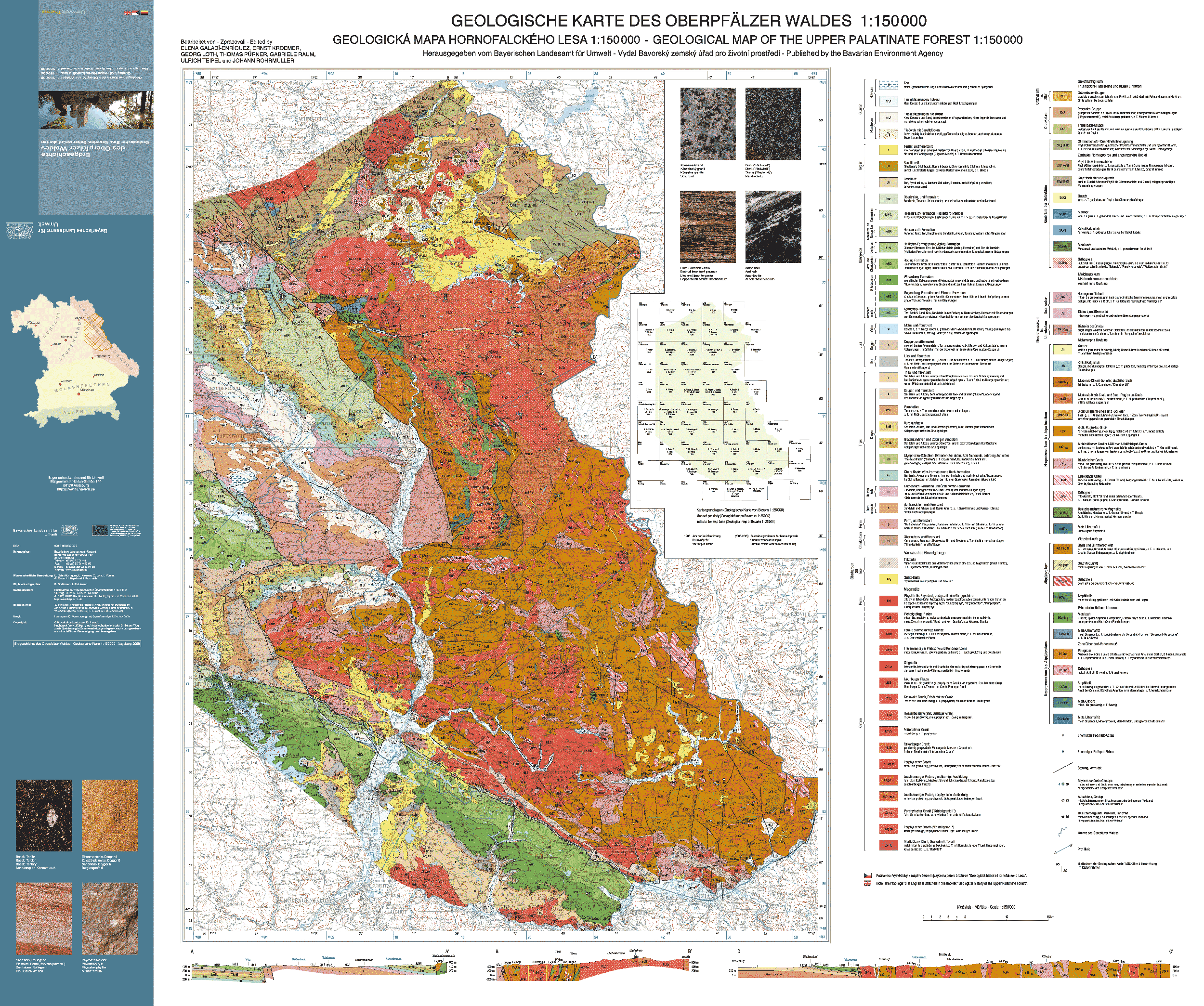 In der Karte sind 77 Aufschlüsse, Geotope, Besucherbergwerke, Museen und Lehrpfade eingetragen, die im Erläuterungsband kurz beschrieben sind. Der Text geht außerdem kurz aber möglichst verständlich auf die Erdgeschichte des Oberpfälzer Waldes ein. Geologische Karte 1:150 000, Legende und Erläuterung in deutsch, englisch und tschechisch.Digitale Vektordaten (GIS-Shapefiles, Datenbankauszug und georeferenz. Rasterkarte) können Sie je nach Verfügbarkeit kostenpflichtig bei der Datenstelle des Landesamtes für Umwelt anfordern. Bitte geben Sie gewünschtes TK-Kartenblatt und Verwendungszweck an!