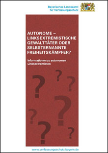 Der Flyer informiert über die gewaltbereite linksextremistische Szene in Bayern. Neben Zielen und Strategien autonomer Linksextremisten werden im Faltblatt auch szenetypische Rekrutierungsmethoden und Radikalisierungsmerkmale benannt. Der Flyer richtet sich insbesondere an Lehrer, Pädagogen und Eltern sowie an interessierte Bürgerinnen und Bürger.Herausgeber | : | Bayerisches Landesamt für Verfassungsschutz |