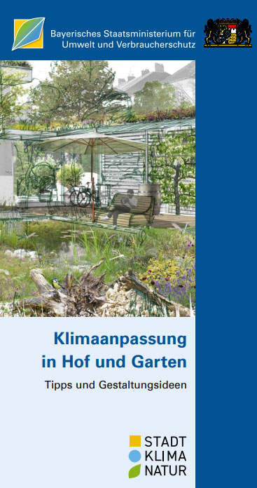 Die Folgen des Klimawandels sind auch in unseren Gärten gegenwärtig: Hitze, Trockenheit und Starkregen hinterlassen ihre Spuren. Pflanzen müssen häufiger gegossen werden, und auch Tiere leiden unter langanhaltender Hitze und sind auf Wasser angewiesen. Gepflasterte oder asphaltierte Flächen heizen sich auf und treiben die Temperaturen rund ums Haus weiter nach oben. Nach heftigen Regenfällen kann das Wasser auf diesen versiegelten Flächen nicht versickern. Wer seinen Hof oder Garten rechtzeitig an diese klimabedingten Veränderungen anpasst, macht ihn fit für die Zukunft.Das Faltblatt zeigt anschaulich mit welchen Maßnahmen Hinterhöfe und Gärten auch künftig lebenswerte und artenvielfältige Orte bleiben.