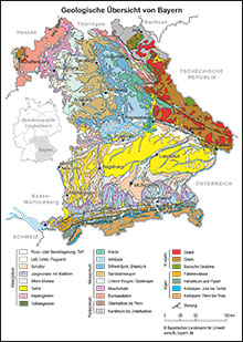 Das Bayerische Landesamt für Umwelt hat eine geologische Übersichtskarte von Bayern im Format DIN A6 erstellt. Zur Orientierung dienen die wichtigsten Städte und Flüsse. Die geologischen Informationen sind durch die Zusammenfassung vieler Kartiereinheiten zu größeren erdgeschichtlichen Epochen sehr übersichtlich gehalten. Die Karte ermöglicht so einen schnellen Überblick über den geologischen Aufbau von Bayern.| Herausgeber | : | Bayerisches Landesamt für Umwelt |
