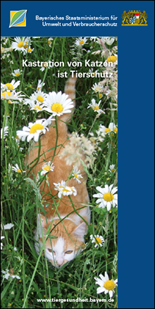 Zu einer verantwortungsbewussten Katzenhaltung gehört nicht nur die Versorgung mit Futter und Wasser. Unerlässlich sind auch bestimmte medizinische Maßnahmen, z. B. Impfungen, Parasitenbehandlungen und die Kastration vor der Geschlechtsreife zumindest der Katzen und Kater, die Auslauf ins Freie haben. Leider sorgen nicht alle Besitzer dafür, dass dieser so wichtige Eingriff durchgeführt wird. Dieses Faltblatt enthält wichtige Informationen zur Kastration von Katzen und soll dazu beitragen, Ihnen eine Entscheidung im Sinne des Tierschutzes zu erleichtern.| Herausgeber | : | Bayerisches Staatsministerium für Umwelt und Verbraucherschutz |