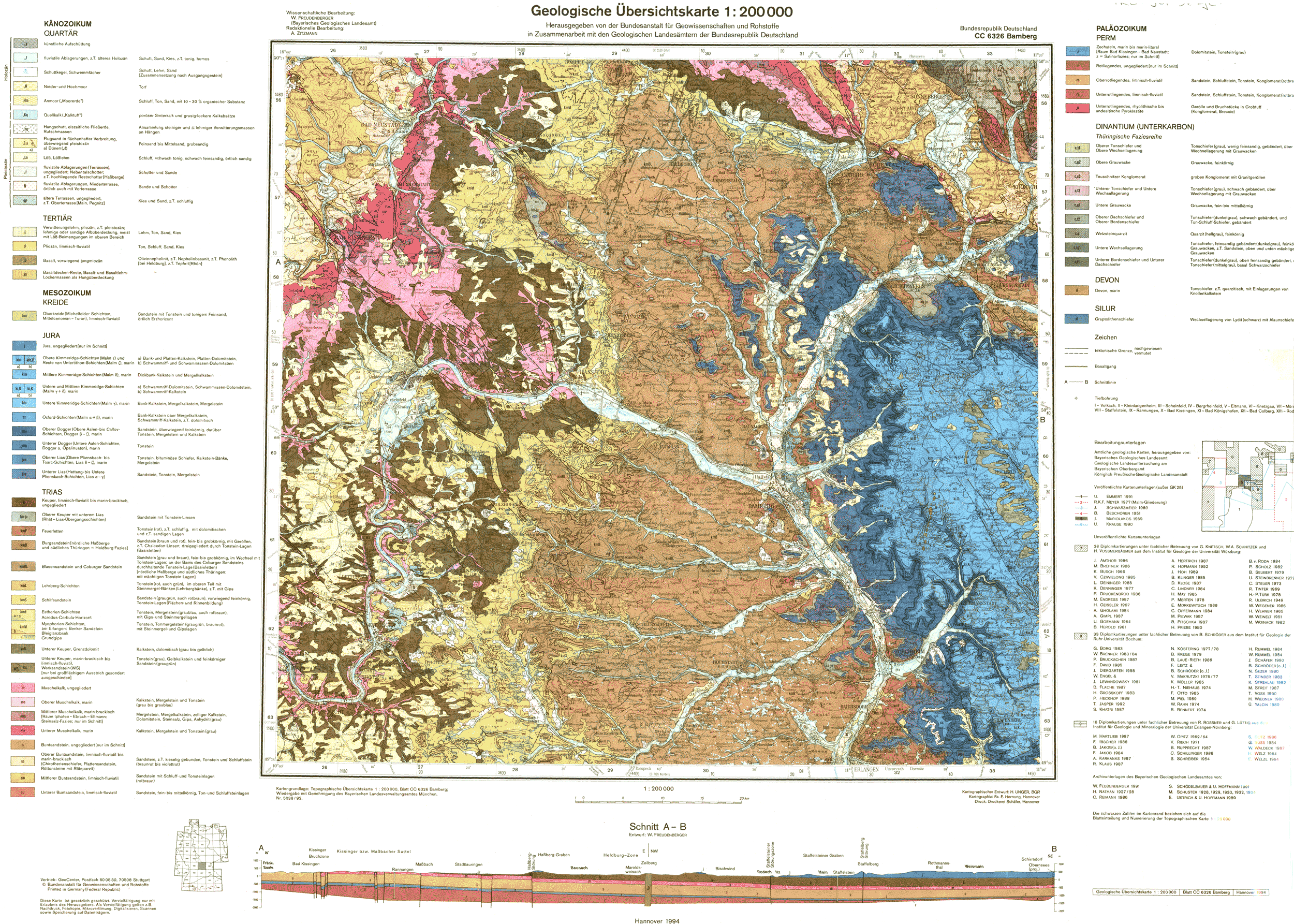 Die Geologische Karte 1:200 000 ist ein Gemeinschaftsprodukt der Staatlichen Geologischen Dienste (SGD) von Deutschland und der Bundesanstalt für Geowissenschaften und Rohstoffe (BGR) in Hannover, was zwischen 1973 und 1994 bearbeitet wurde. Dargestellt sind Stratigraphie, Petrographie und Genese der Gesteine. Zu beachten sind blattschnittbezogene Inkonsistenzen sowohl der Geometrien als auch der geologischen Einheiten, da die einzelnen Kartenblätter aus verschiedenen Bearbeitungszeiträumen stammen. Der Bezug der Vektor-Daten und der Bild-Scans erfolgt über das Produktcenter der BGR.Bezug der Vektor-Daten und der Bild-Scans über: Produktcenter der BGR