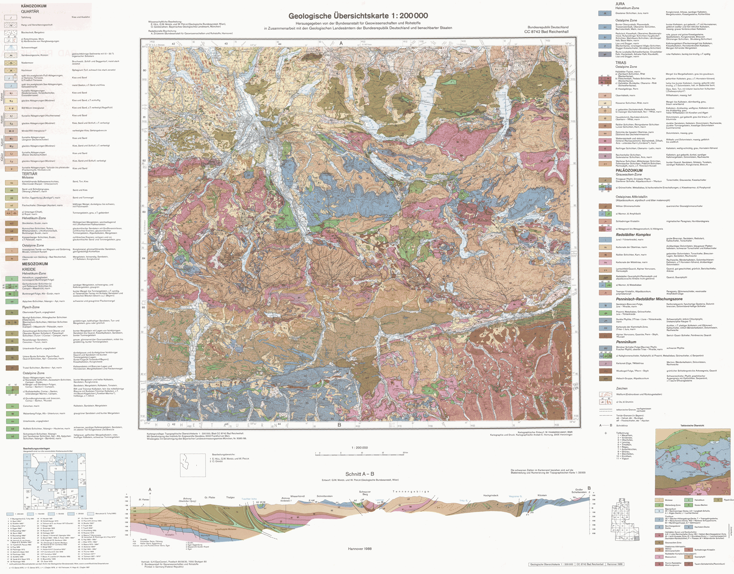 Die Geologische Karte 1:200 000 ist ein Gemeinschaftsprodukt der Staatlichen Geologischen Dienste (SGD) von Deutschland und der Bundesanstalt für Geowissenschaften und Rohstoffe (BGR) in Hannover, was zwischen 1973 und 1994 bearbeitet wurde. Dargestellt sind Stratigraphie, Petrographie und Genese der Gesteine. Zu beachten sind blattschnittbezogene Inkonsistenzen sowohl der Geometrien als auch der geologischen Einheiten, da die einzelnen Kartenblätter aus verschiedenen Bearbeitungszeiträumen stammen. Der Bezug der Vektor-Daten und der Bild-Scans erfolgt über das Produktcenter der BGR.Bezug der Vektor-Daten und der Bild-Scans über: Produktcenter der BGR