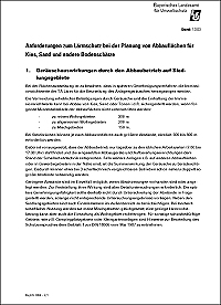 Für die Planung von Abbauflächen werden Abstände zu schutzbedürftigen Baugebieten genannt, bei deren Einhaltung i. d. R. keine erheblichen Lärmbelästigungen durch den Abbaubetrieb mehr zu erwarten sind. Ergänzend wird auf mögliche Lärmbelästigungen an den Zufahrtswegen und in Erholungsgebieten hingewiesen.| Herausgeber | : | Landesamt für Umweltschutz |