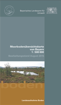 Die Moorbodenübersichtskarte 1:500 000 (MBÜK500) zeigt die Verbreitung von Hochmooren, Niedermooren und Anmooren (Bearbeitungsstand Juli 2015). Die Moorbodenflächen wurden aus dem für ganz Bayern vorliegenden Geodatensatz der Übersichtsbodenkarten von Bayern 1:25 000 (ÜBK25) abgeleitet.Eine Nebenkarte zeigt die Verfügbarkeit zukünftiger Moorbodenkarten von Bayern 1:25 000. Die Auswahl der ÜBK25-Legendeneinheiten für die Klassifizierung und Darstellung der Moorbodenflächen erfolgte expertengestützt durch die Landesaufnahme Boden (Referat 103, LfU) auf Basis der IPCC Guidelines für organische Böden (2006).