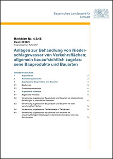 Dieses LfU-Merkblatt ist Teil der "Sammlung von Schriftstücken (Merkblätter, Schreiben, Hinweise) der Bayerischen Wasserwirtschaft (Slg Wasser)", es behandelt Bauprodukte und Bauarten zur Behandlung mineralölhaltiger Niederschlagsabflüsse von Verkehrsflächen zur anschließenden Versickerung, die vom Deutschen Institut für Bautechnik (DIBt) allgemein bauaufsichtlich zugelassen wurden.Die Angaben werden zur Planung bzw. zur wasserrechtlichen Begutachtung und Genehmigung von Niederschlagswassereinleitungen auf Grundlage folgender Regelungen benötigt: