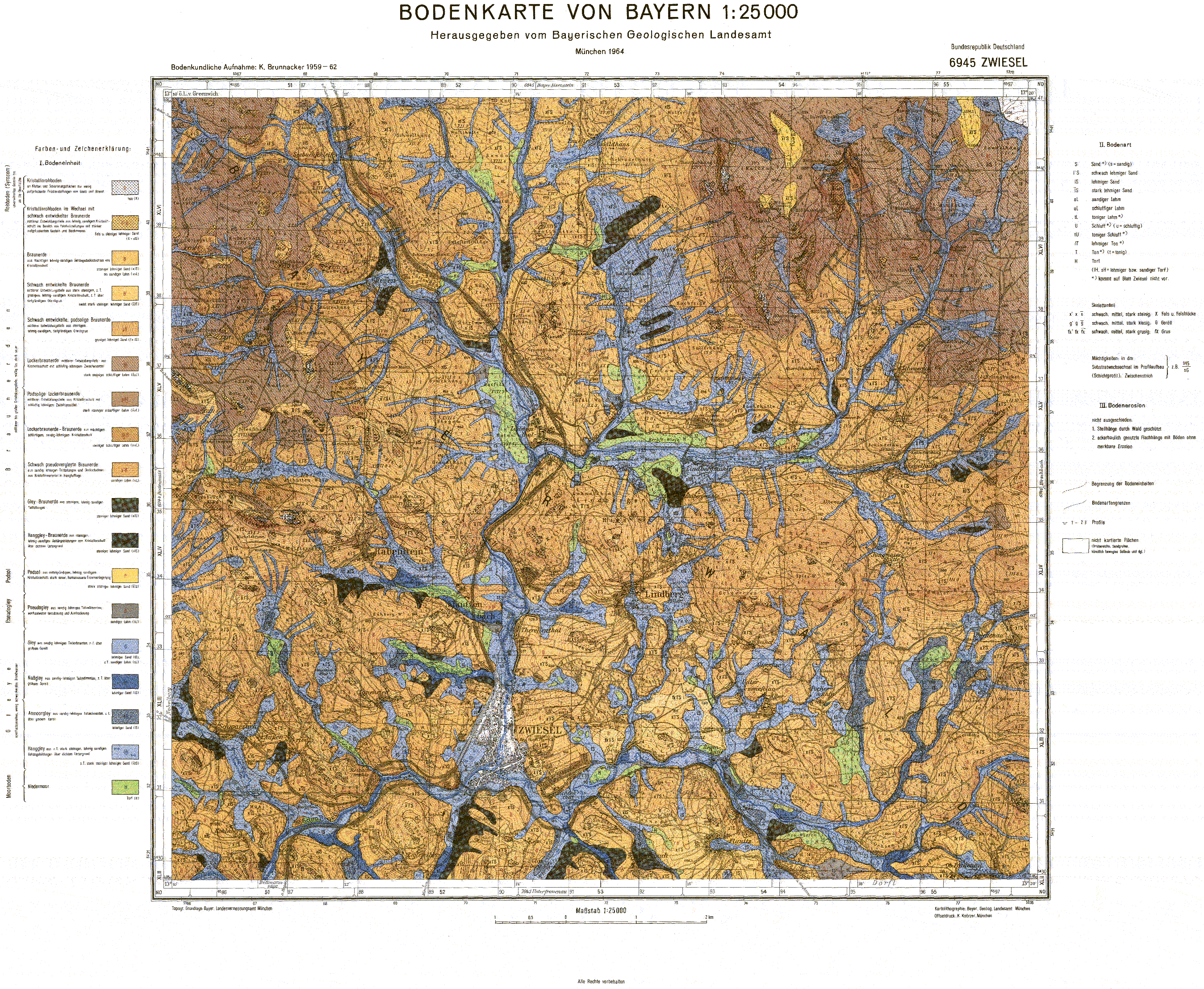 23 Bodenkarten im Maßstab 1:25 000 (BK25) wurden von 1957 bis 1978 beispielhaft in unterschiedlichen Bodenregionen erstellt.Weitere Informationen über die Daten sowie Online-Kartendienste erhalten Sie beim Geologischen Dienst des LfU.
