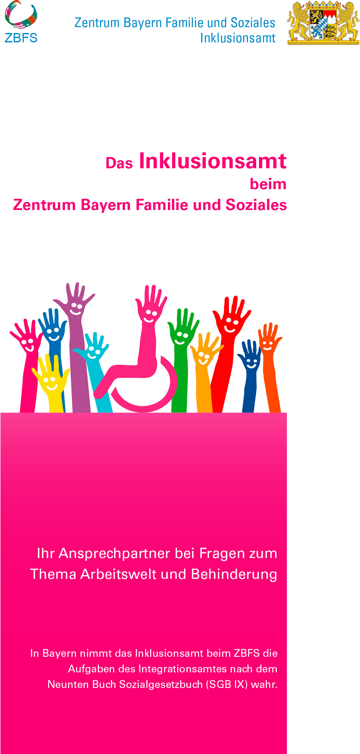 In Bayern nimmt das Inklusionsamt beim ZBFS die Aufgaben des Integrationsamtes nach dem SGB IX wahr. Damit ist das Inklusionsamt für die Sicherung der Arbeitsverhältnisse schwerbehinderter und gleichgestellter Menschen zuständig. Dazu kann es Maßnahmen ergreifen oder Leistungen erbringen, um Arbeitsplätze zu erhalten und Schwierigkeiten am Arbeitsplatz zu verhindern oder zu beseitigen.Herausgeber | : | Zentrum Bayern Familie und Soziales |