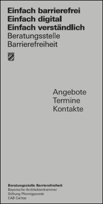 Die Broschüre stellt das Angebot der Beratungsstelle Barrierefreiheit vor, die neutral zu allen Fragen der Barrierefreiheit in sämtlichen Lebensbereichen berät, bayernweit - an 18 Standorten. Betrieben wird die Beratungsstelle von der Bayerischen Architektenkammer. Bei Fragen zur digitalen Barrierefreiheit, zur Leichten Sprache sowie zur Unterstützten Kommunikation arbeitet die Beratungsstelle mit Fachleuten aus der Stiftung Pfennigparade und der CAB Augsburg zusammen. Die Beratungsstelle Barrierefreiheit wird vom Bayerischen Sozialministerium gefördert. Die Erstberatung ist daher kostenfrei.Herausgeber | : | Bayerische Architektenkammer |
