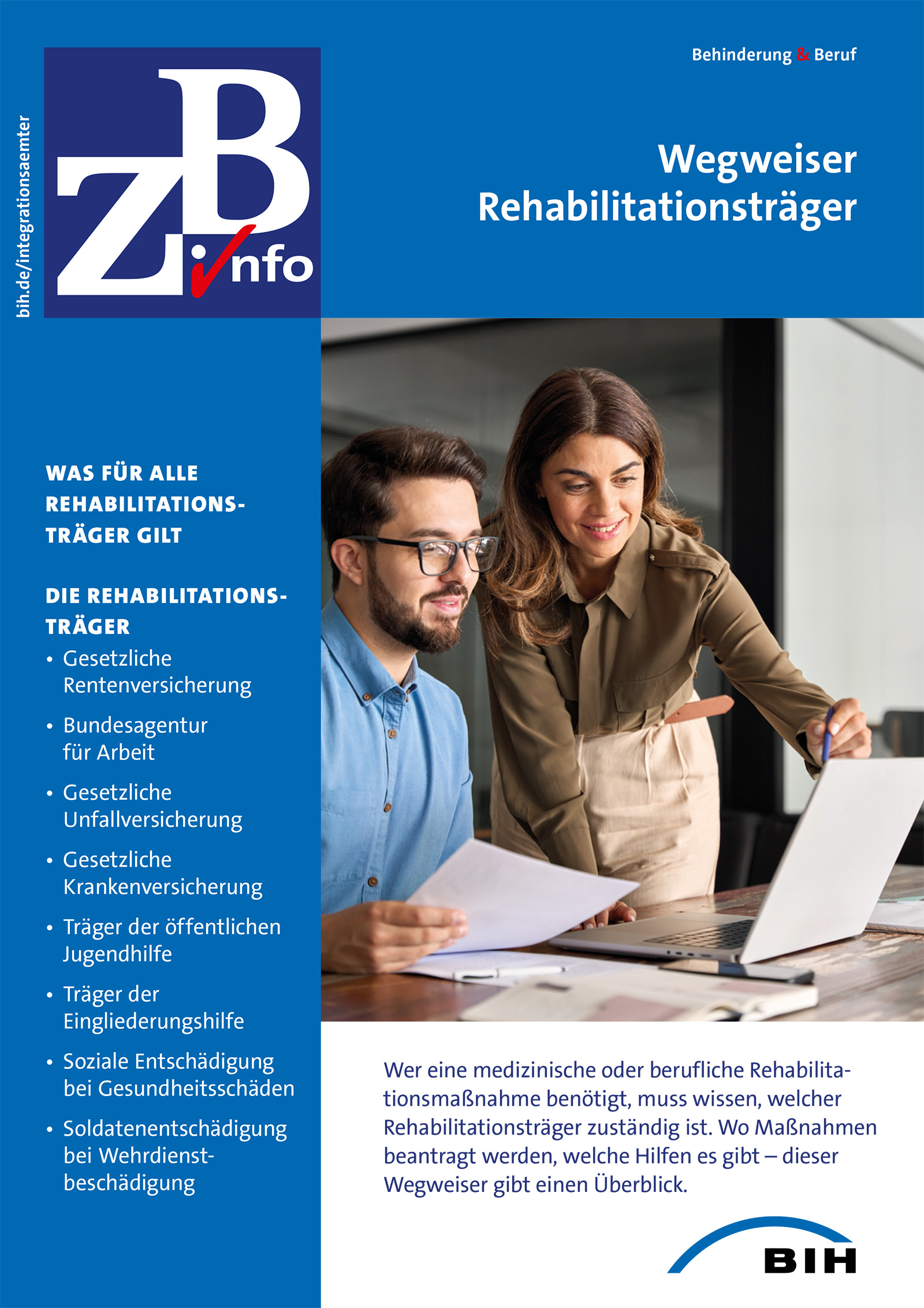 Wer eine medizinische oder berufliche Rehablitationsmaßnahme benötigt, muss wissen, welcher Rehabilitationsträger zuständig ist. Wo Maßnahmen beantragt werden, welche Hilfen es gibt - dieser Wegweiser gibt einen Überblick.Herausgeber | : | Zentrum Bayern Familie und Soziales |