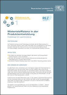 Im vorliegenden Leitfaden "Materialeffizienz in der Produktentwicklung" sind Informationen zu einem ressourcenschonenden Produktdesign und Produktzusammensetzung festgehalten. Mit einer detaillierten und vorausschauenden Planung von Art und Menge der im Produkt benötigten Materialien können früh Einsparpotenziale ermittelt werden. Materialien und Kosten werden so effizient eingesetzt und legen den Grundstein für einen ressourcenschonenden Produktlebenszyklus. Mit Hilfe von Arbeitsblatt 1 kann der geplante oder aktuelle Materialaufwand erfasst und anschließend mittels eines Kriterienkatalogs in Arbeitsblatt 2 möglichst materialeffizient (um)gestaltet/optimiert werden.| Herausgeber | : | Bayerisches Landesamt für Umwelt |