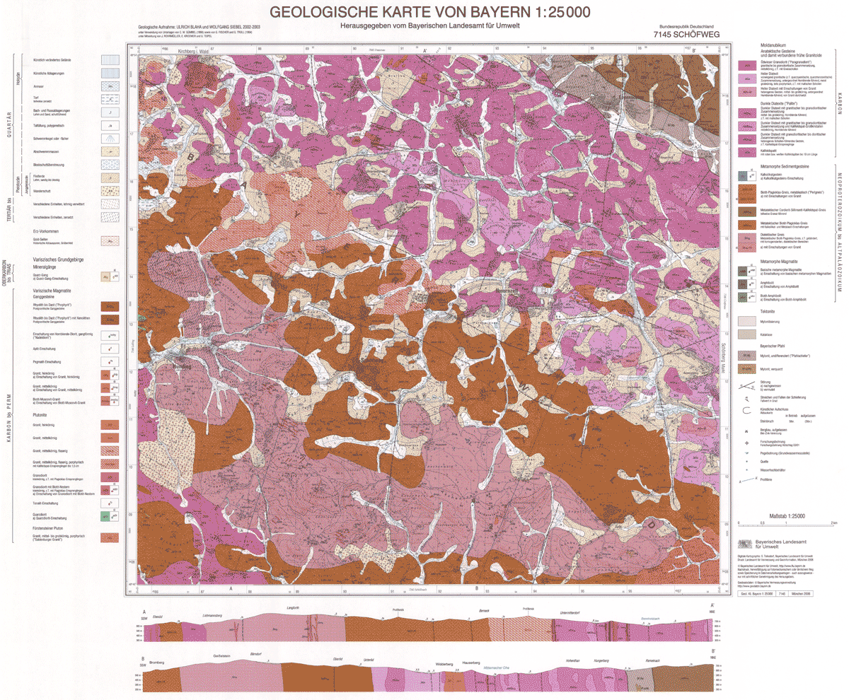 Die Geologische Karte von Bayern im Maßstab 1:25.000 (GK25) stellt das detaillierteste Kartenwerk der Geologischen Landesaufnahme am Bayerischen Landesamt für Umwelt (LfU) dar. Sie gibt die im Bereich der Geländeoberfläche anstehenden Locker- und Festgesteine wieder und ermöglicht damit Rückschlüsse auf den geologischen Bau.Die digitale Version der GK25 (dGK25) steht in ihrer jeweils neuesten Fassung im UmweltAtlas Bayern flächendeckend zur Verfügung und entspricht dem aktuellen Erkenntnisstand der Geologischen Landesaufnahme am LfU. Die dGK25 können Sie direkt aus dem UmweltAtlas Bayern als Shapedatei herunterladen.